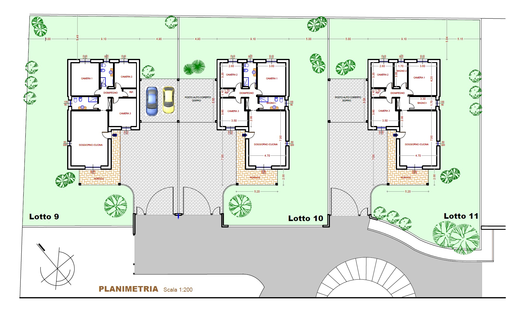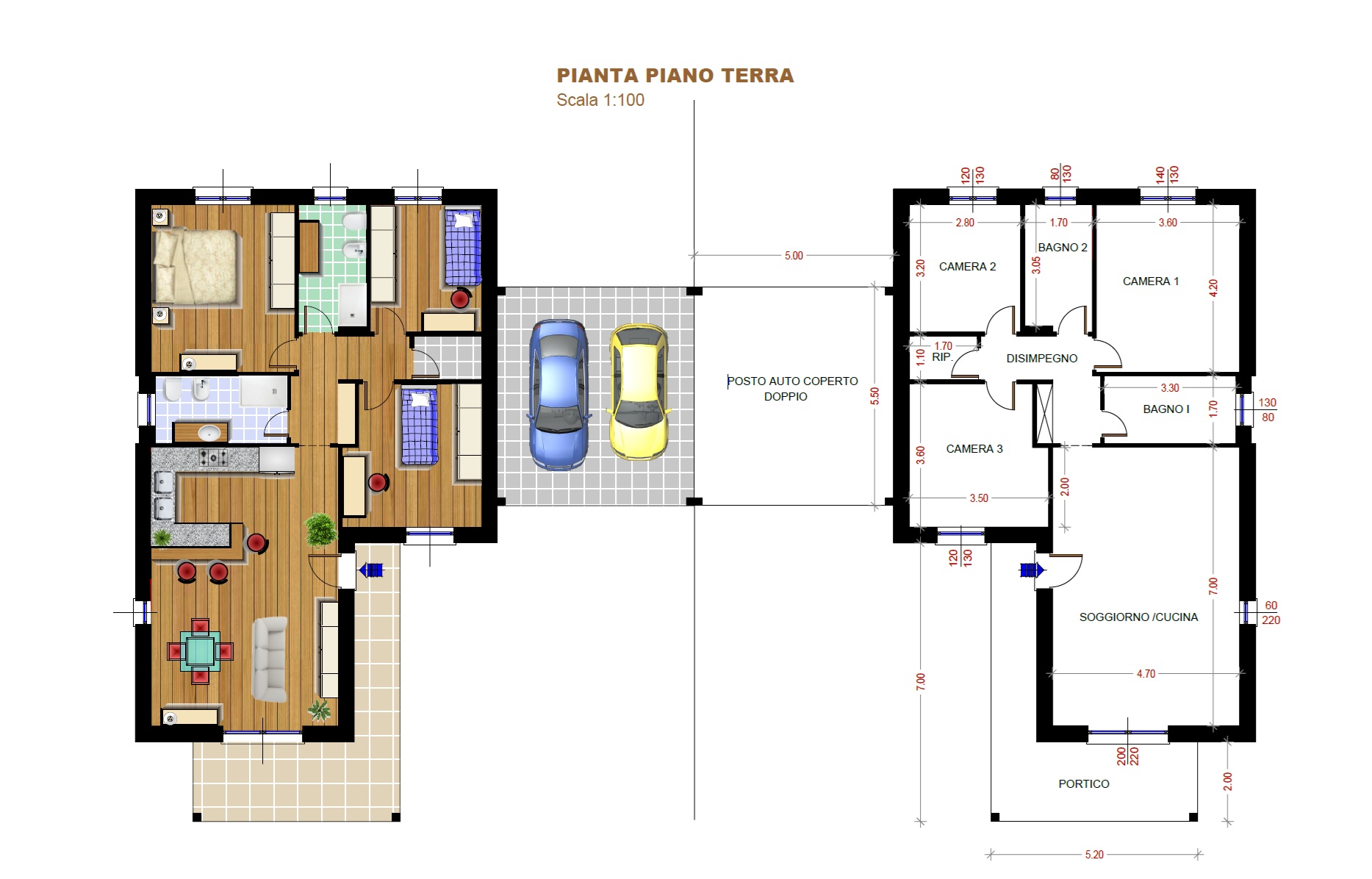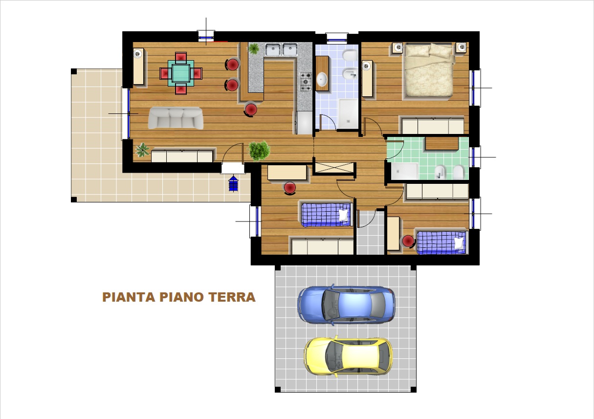 Ogni villa si distingue per una distribuzione degli spazi studiata per garantire comfort e funzionalità. Al piano terra si apre un ampio soggiorno con cucina a vista, ideale per momenti di convivialità e vita quotidiana. La zona notte comprende tre camere da letto, doppi servizi, un pratico ripostiglio e un porticato esterno che si affaccia sul giardino privato, perfetto per pranzi all’aperto e momenti di relax.